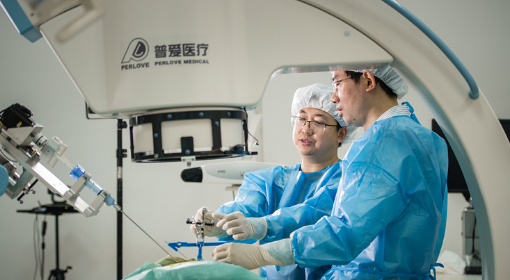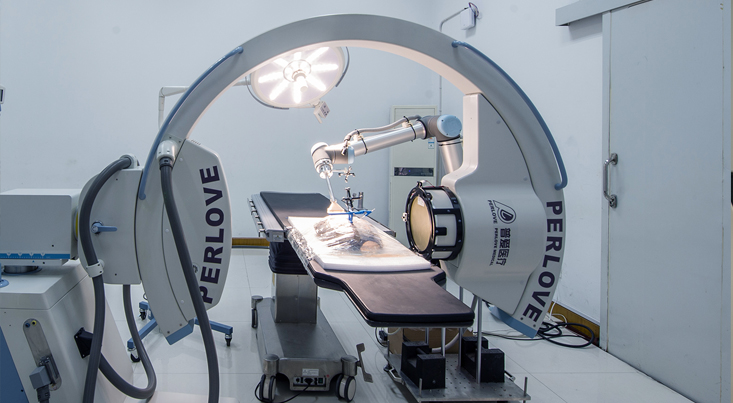 位于南京普愛醫(yī)療的椎體強(qiáng)化手術(shù)室內(nèi),一場特殊的骨科手術(shù)正在進(jìn)行:手術(shù)室中只有“病患”和一臺3D C形臂,一個椎體強(qiáng)化手術(shù)操作機(jī)器人,沒有醫(yī)生在旁。這些機(jī)械猶如自己有意識般,3D C形臂給人體標(biāo)本進(jìn)行術(shù)中拍片,機(jī)器人則根據(jù)3D C形臂拍攝的高清三維圖像進(jìn)行手術(shù)定位、椎體鉆孔、放球囊、填充骨水泥等治療過程。
