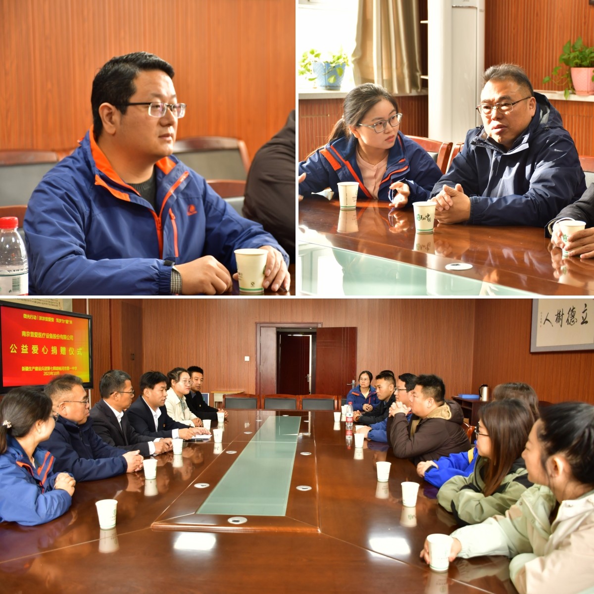 公益小組和校領(lǐng)導(dǎo)、外省援疆的老師們進行了深入的交流,詳細了解學(xué)校和當(dāng)?shù)貙W(xué)生的情況。胡楊河市第一中學(xué)位于新疆建設(shè)兵團第七師胡楊河市,是江蘇省對口援疆學(xué)校,在校生1300余名,有10名省外支教的老師。近年來,因為公益組織和愛心企業(yè)的捐贈,學(xué)校的辦學(xué)條件越來越好,學(xué)生也能在更舒適的環(huán)境中努力學(xué)習(xí)。
