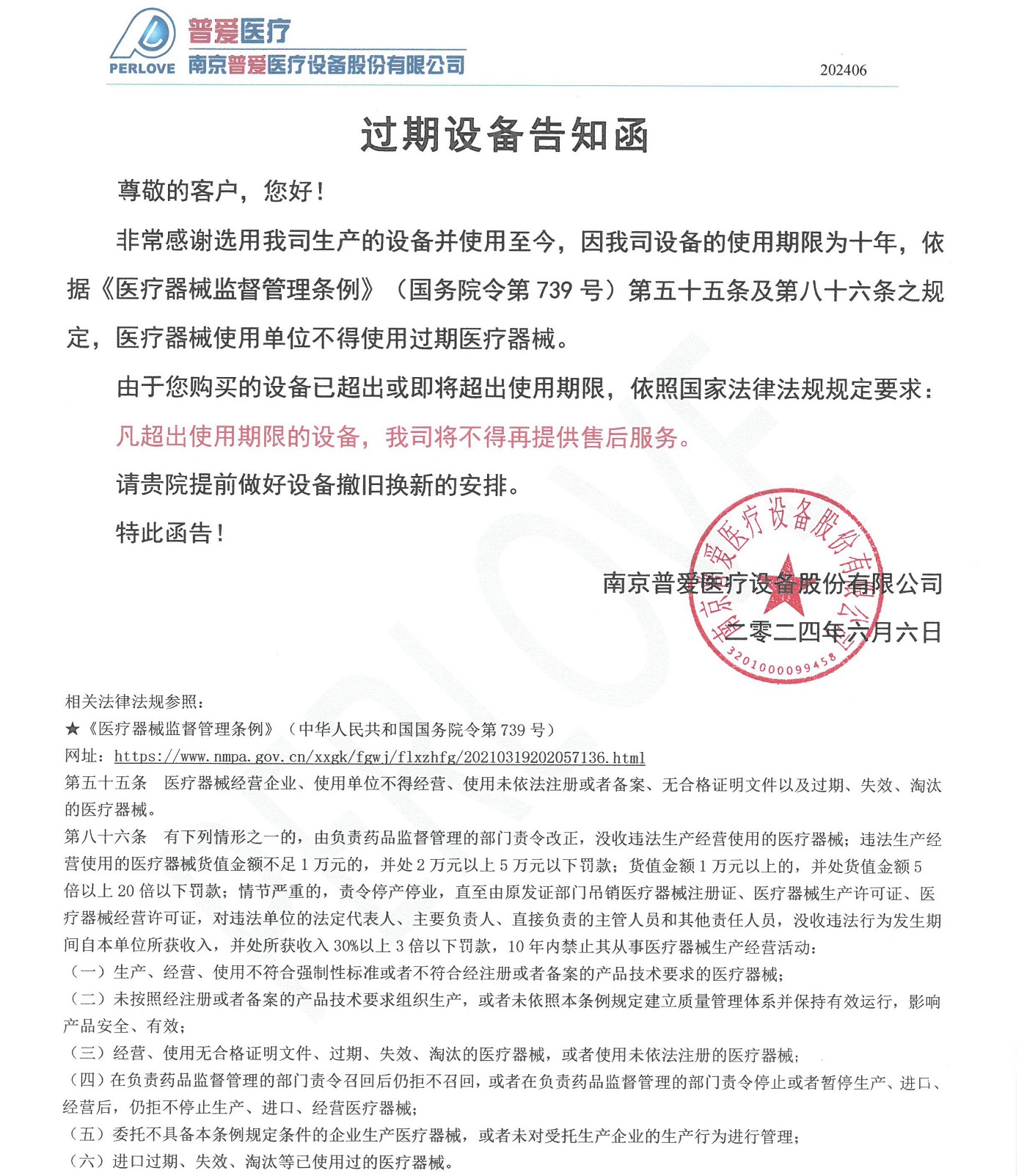 非常感謝選用我司生產(chǎn)的設(shè)備并使用至今,因我司設(shè)備的使用期限為十年,依據(jù)《醫(yī)療器械監(jiān)督管理?xiàng)l例》(國務(wù)院令第 739號)第五十五條及第八十六條之規(guī)定,醫(yī)療器械使用單位不得使用過期醫(yī)療器械。