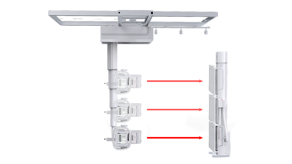 懸吊配備手動(dòng)模式與電動(dòng)模式,沿天軌橫縱移動(dòng)時(shí)可選手動(dòng)或電動(dòng),滿足不同醫(yī)護(hù)人員使用習(xí)慣。